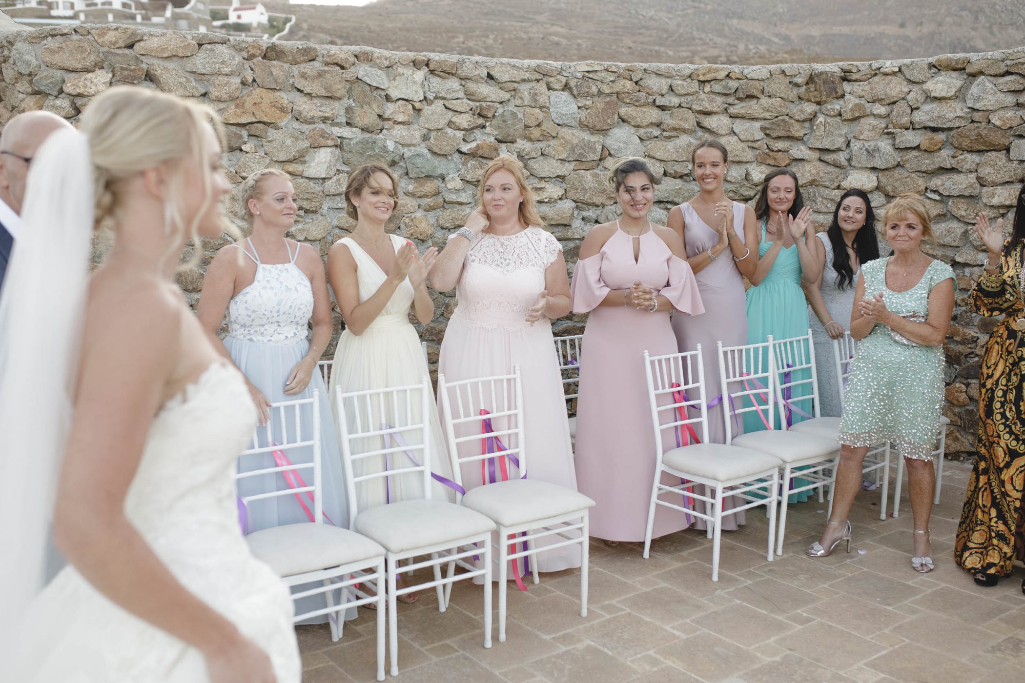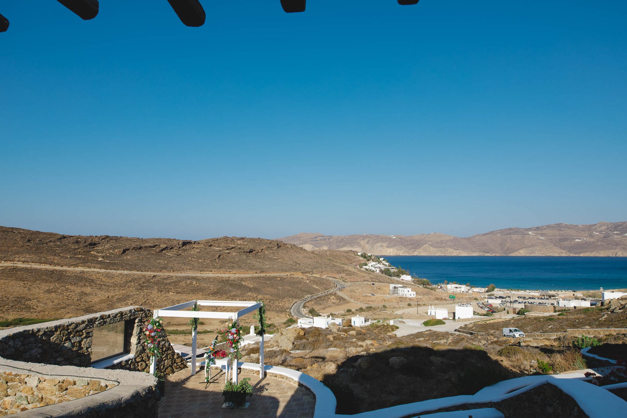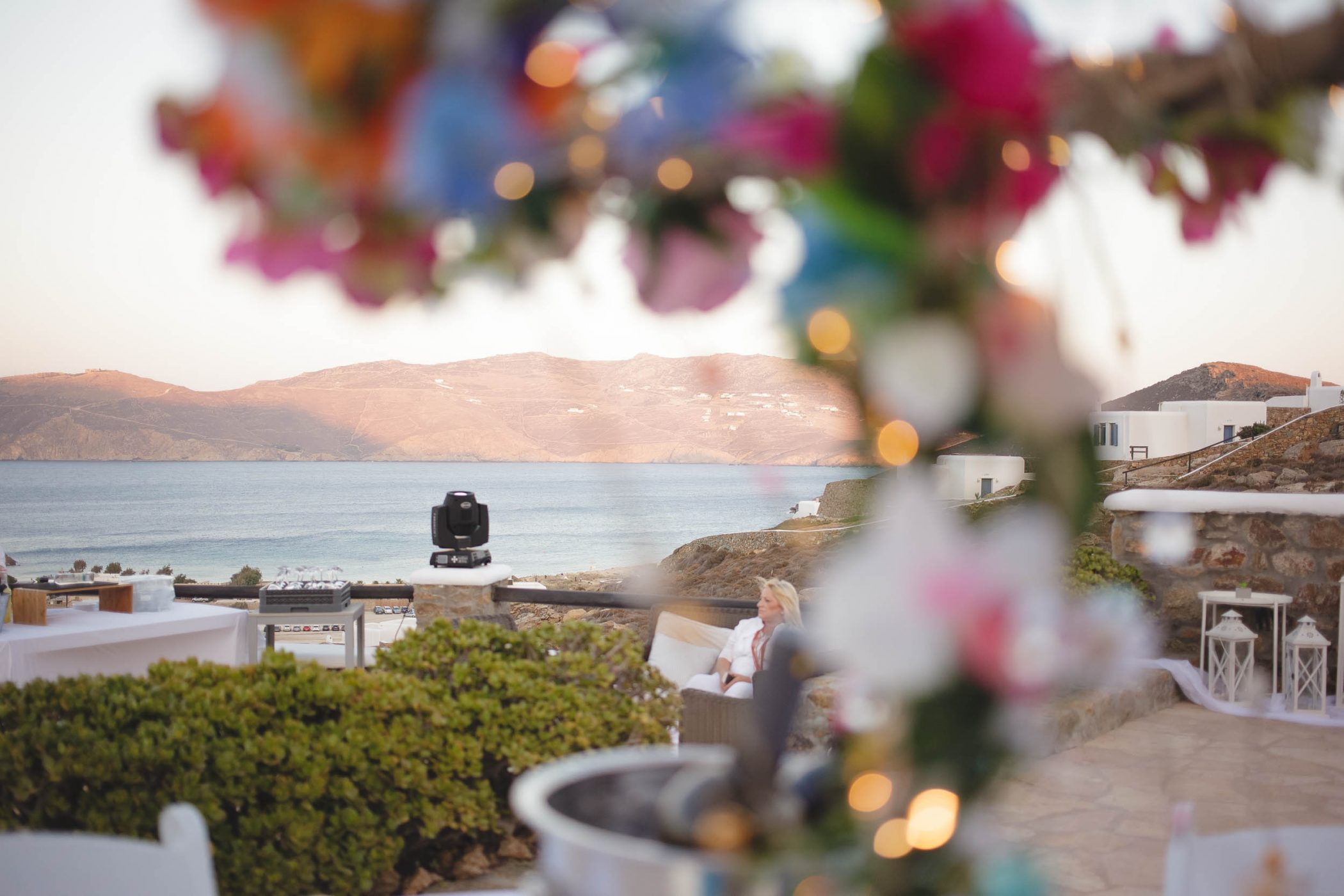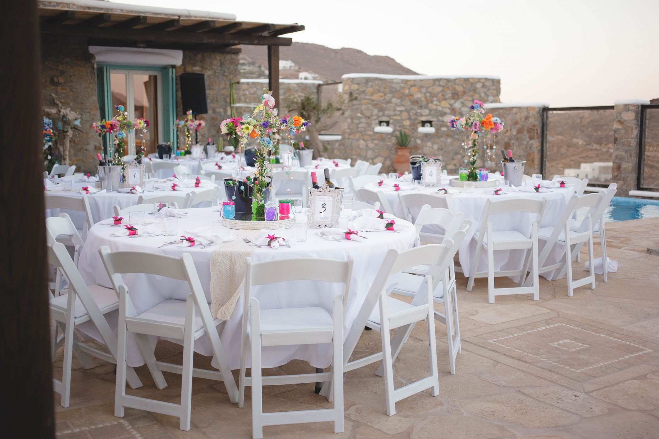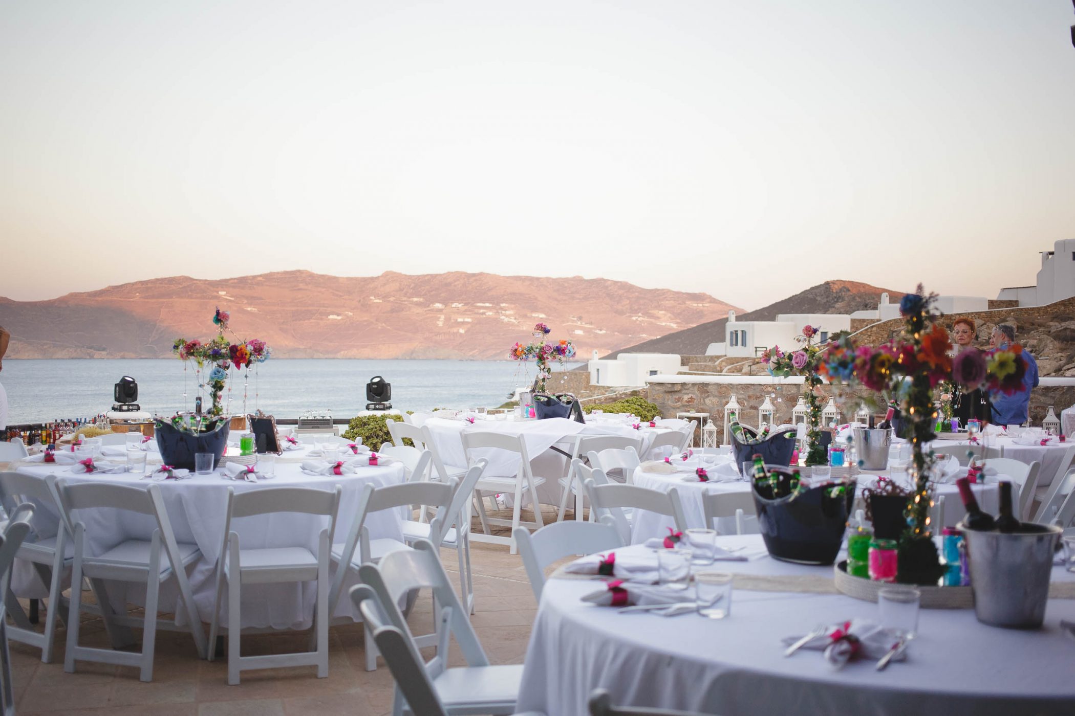 Jad and Hannah trusted their dream to Diamond Events and their team put eveything together. The ceremony and the wedding party took place at Mykonos Panormos Villas, on a rocky hill decorated with luxurious villas. The ceremony was staged at the edge of the villa viewing over the Panormos bay. The wedding party was held next to the villa’s pool between the open bar and the dining area. The decoration had Diamond Event’s touch with colorful flowers, greek details and a romantic feel.