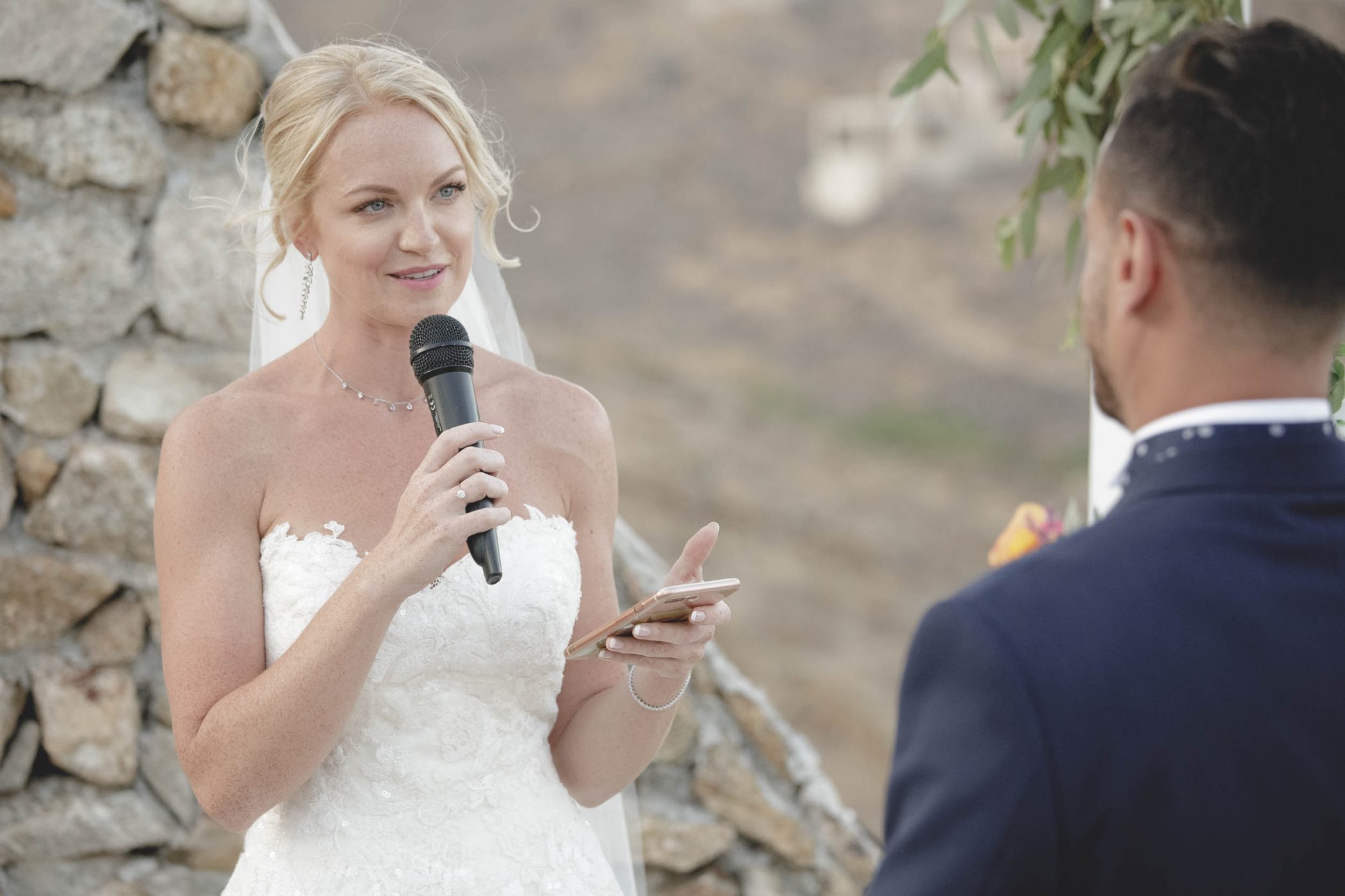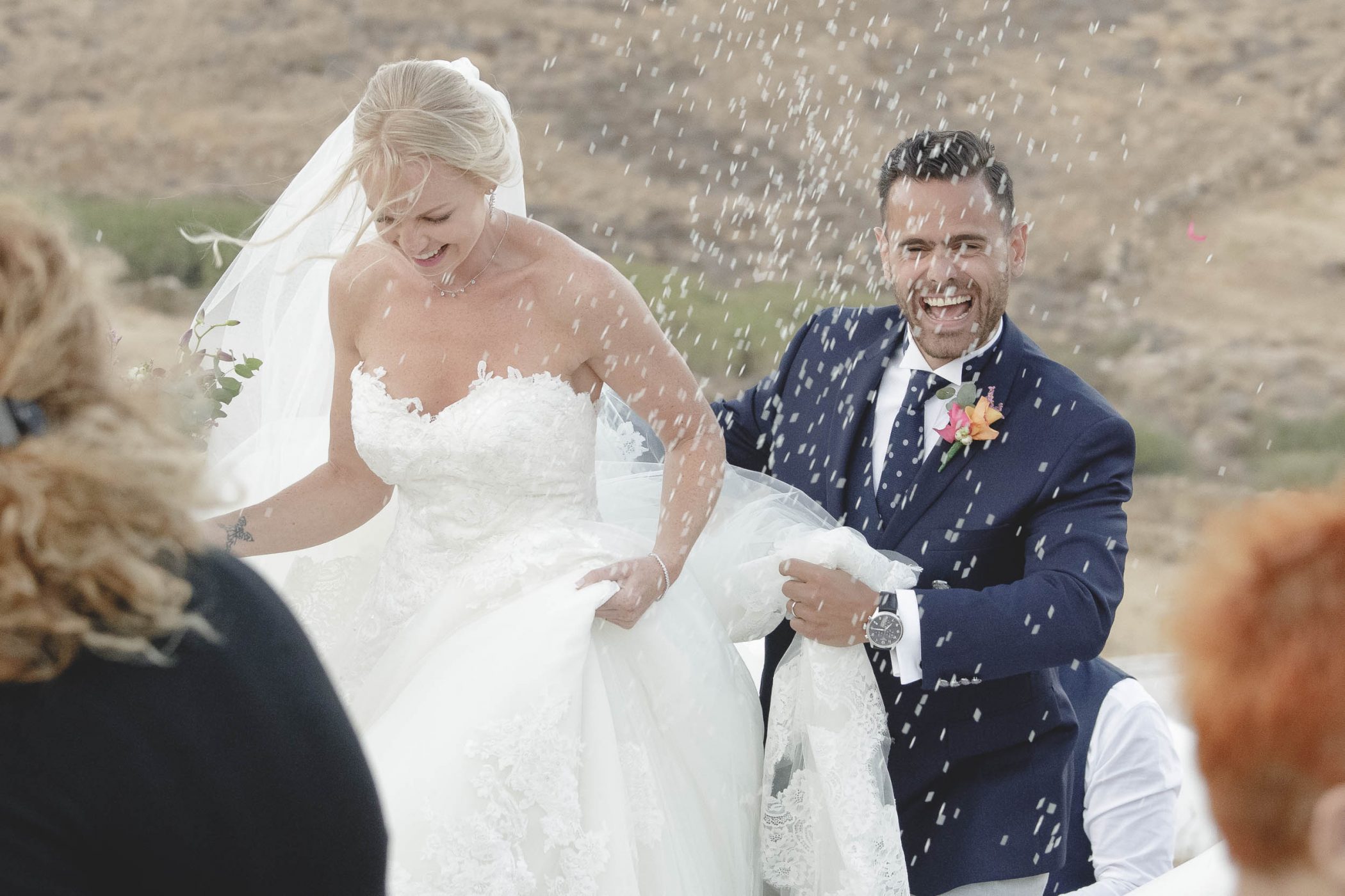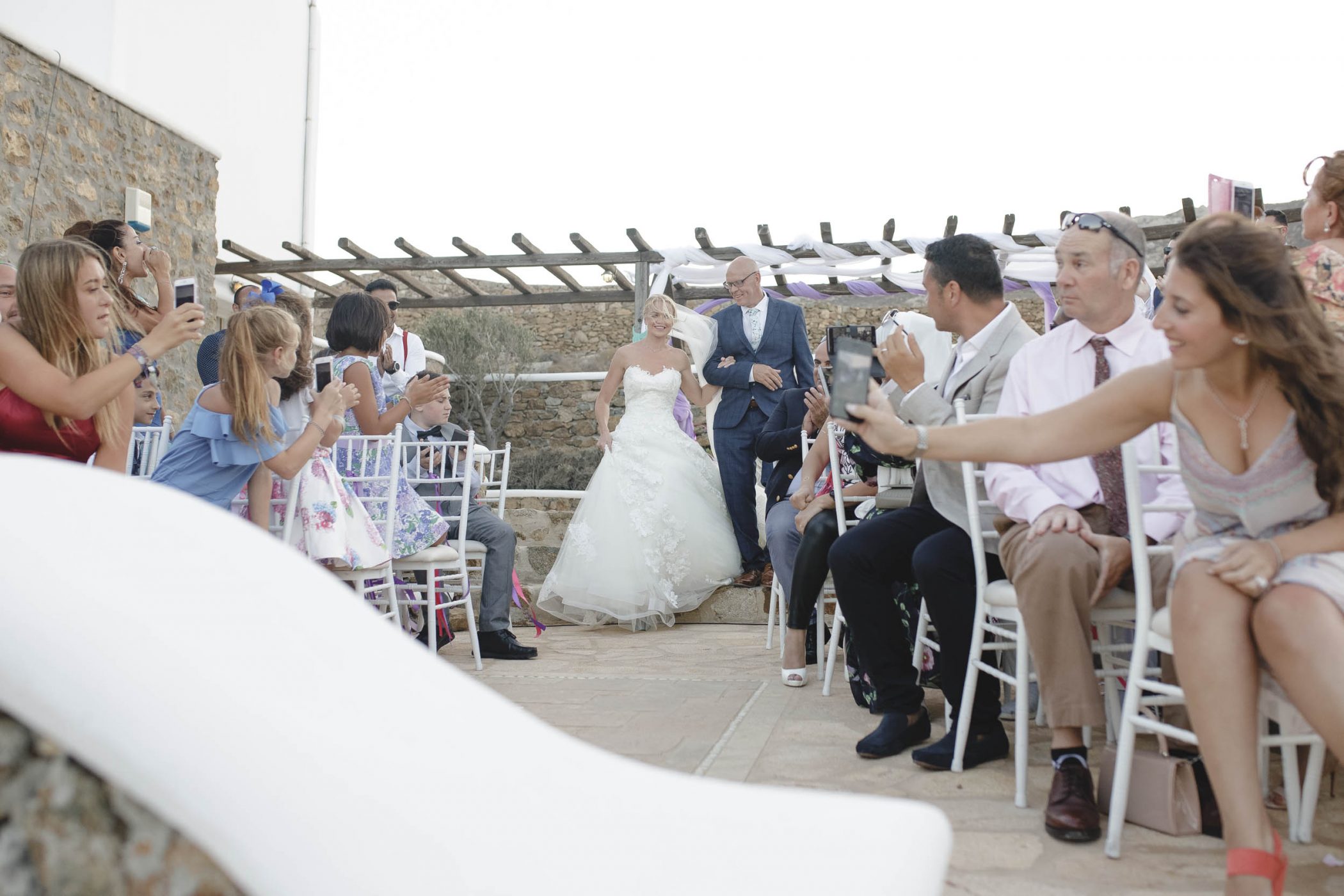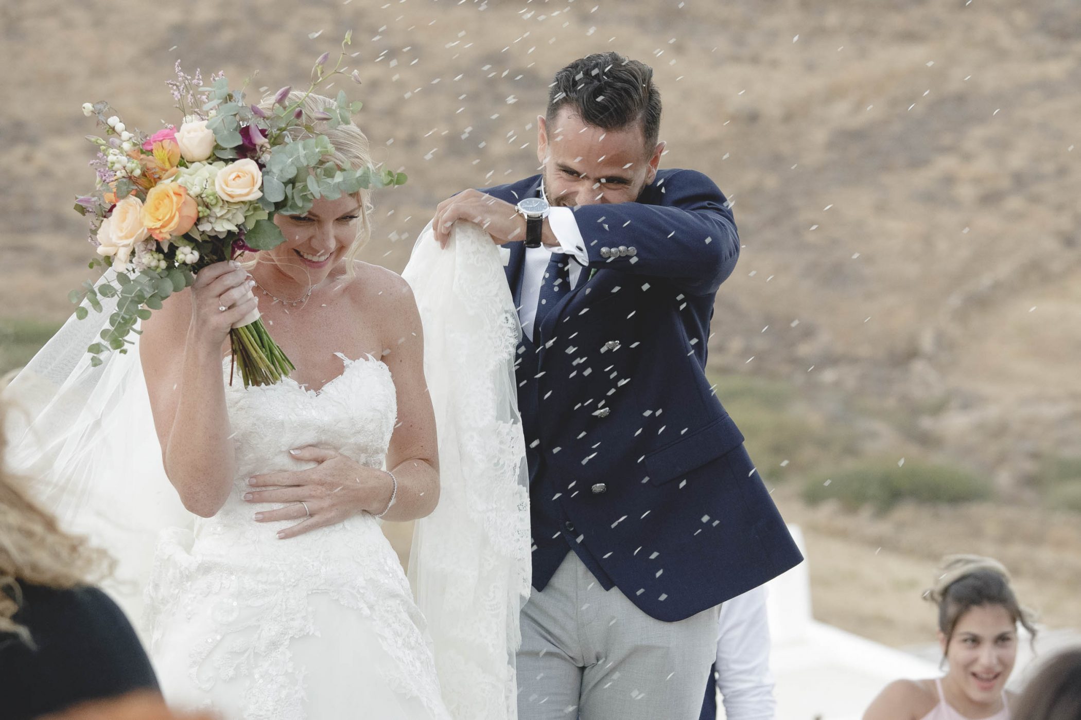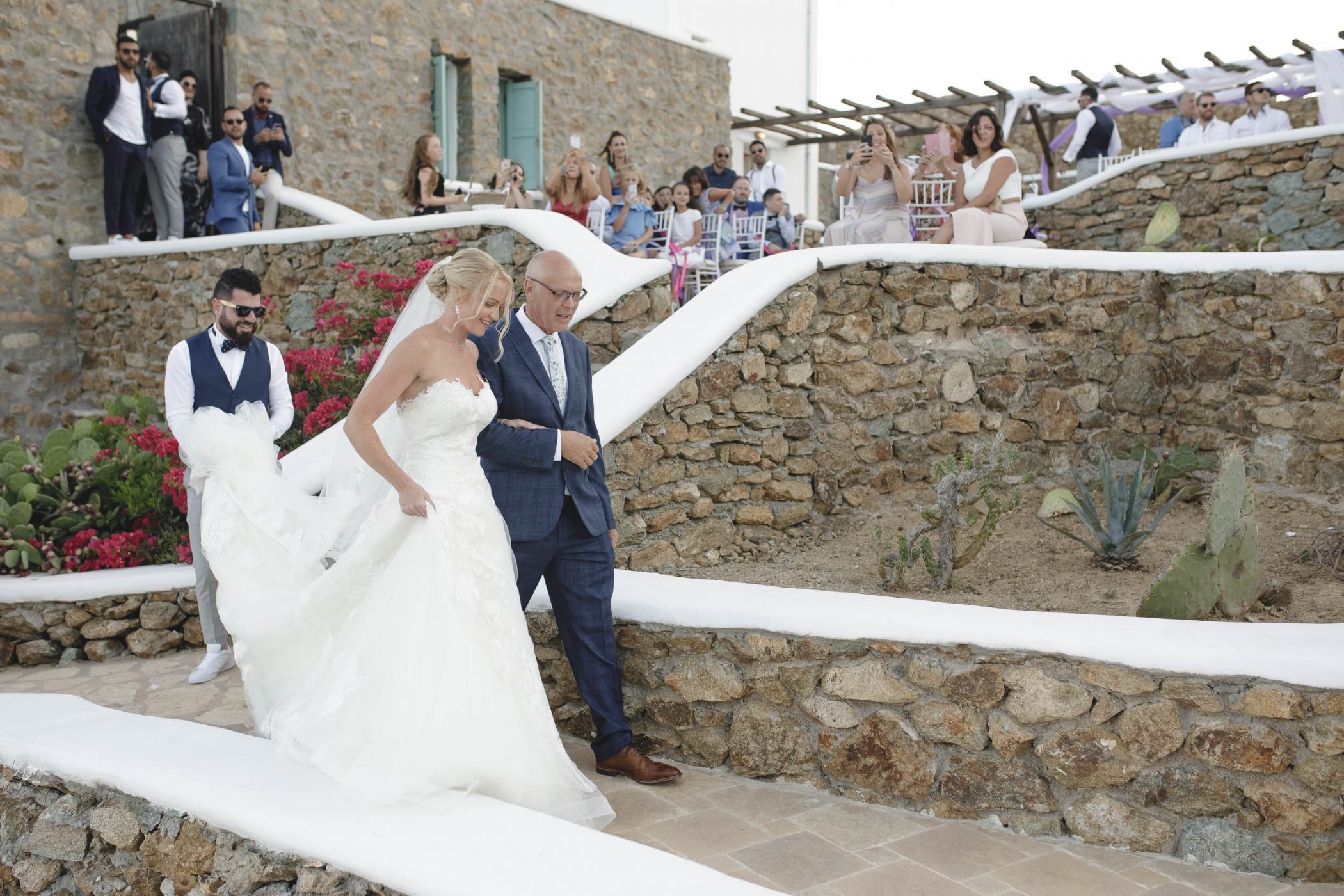 Jad and Hannah trusted their dream to Diamond Events and their team put eveything together. The ceremony and the wedding party took place at Mykonos Panormos Villas, on a rocky hill decorated with luxurious villas. The ceremony was staged at the edge of the villa viewing over the Panormos bay. The wedding party was held next to the villa’s pool between the open bar and the dining area. The decoration had Diamond Event’s touch with colorful flowers, greek details and a romantic feel.
